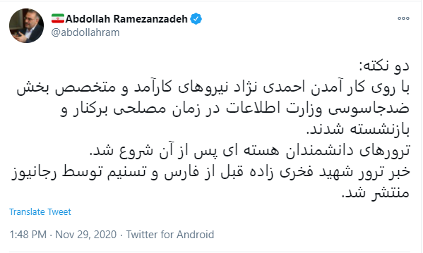 وفي هذا الصدد، نشر الاستاذ المتقاعد في كلية الحقوق والعلوم السياسية بجامعة طهران “عبد الله رمضان زاده” تغريدة على تويتر أشار فيها إلى خطورة وأسباب التقصير الأمني الذي ظهر في عملية استهداف فخرى زاده.