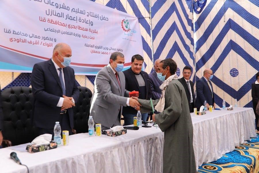 شهد وزير القوى العاملة، محمد سعفان، واللواء أشرف الداودي، محافظ قنا، حفل افتتاح تسليم مشروعات تنموية وإعادة إعمار المنازل بقرية السمطا بحري بمحافظة قنا، بالتعاون مع مؤسسة “صناع الخير”، ضمن مبادرة “صيادي مصر” التي أطلقتها وزارة القوى العاملة لرعاية صغار الصيادين.