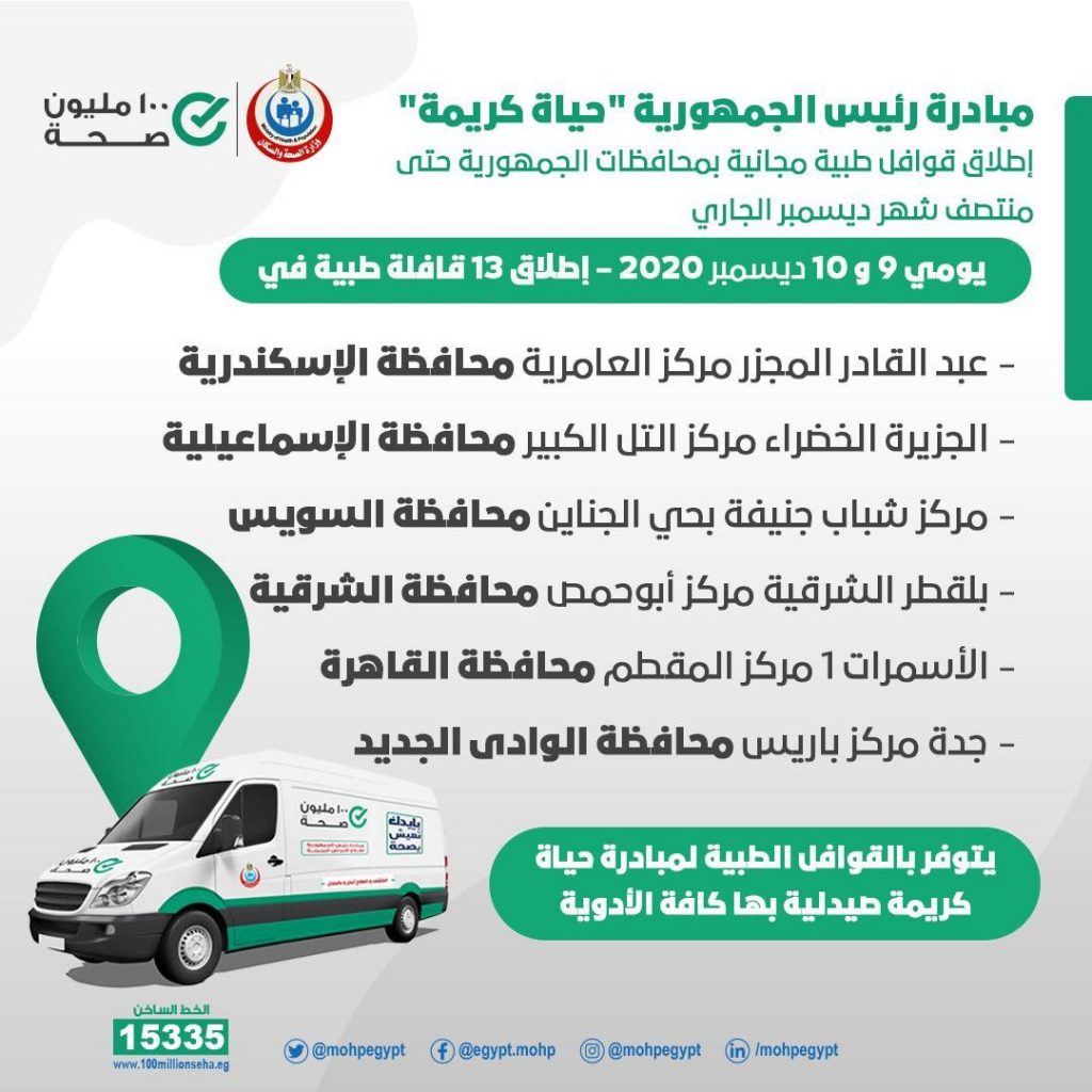 أعلنت وزارة الصحة إطلاق ١٣ قافلة طبية ضمن مبادرة رئيس الجمهورية “حياة كريمة “، اعتبارًا من الغد ولمدة يومين.