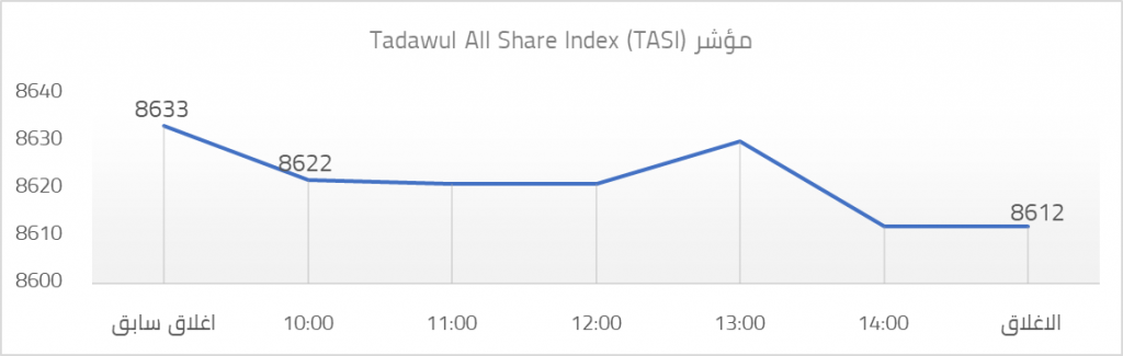 افتتح مؤشر TASI “مؤشر يضم جميع الشركات المقيدة بالسوق السعودي” تعاملاته ليوم 08 ديسمبر عند مستوى 8633 نقطة، وانخفض المؤشر خلال تعاملات جلسة اليوم وأغلق عند مستوى 8612 محققا انخفاضا بمقدار 21 نقطة، أي ما يمثل 0.25%.