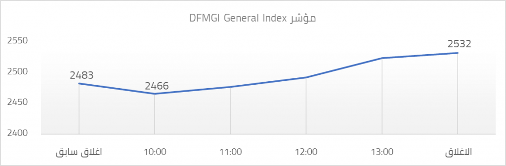 افتتح مؤشر DFGGI “المؤشر العام لسوق دبي المالي” تعاملاته ليوم 08 نوفمبر عند مستوى 2483 وأغلق عند مستوى 2532 محققا ارتفاعا بمقدار 49 نقطة، أي ما يمثل 2%.