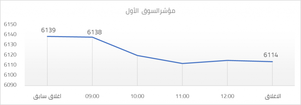 6114 نقطة محققا انخفاضا بمقدار 25 نقطة عن الاغلاق السابق أي ما يمثل 0.41%، تمثل