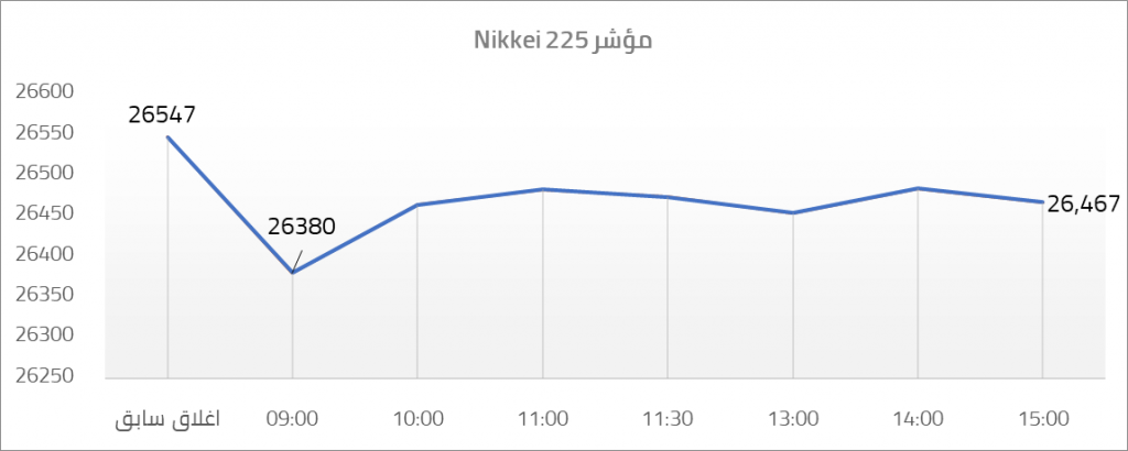 افتتح مؤشر Nikkei 225 “مؤشر يضم أكبر 225 شركة يابانية” تعاملاته ليوم 08 ديسمبر عند مستوى 26547 نقطة، وأغلق عند مستوى 26467 نقطة محققا انخفاضا هامشيا بمقدار 80 نقطة، أي ما يمثل 0.30%.