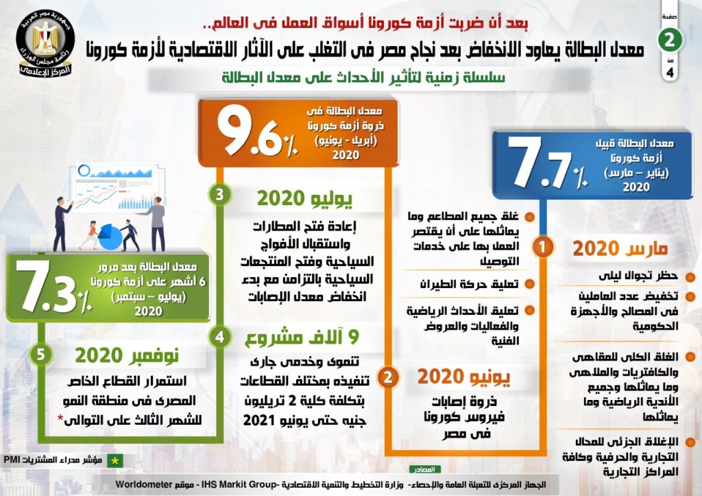 ووفقا للتقرير فإن إعادة فتح المطارات واستقبال الأفواج السياحية وفتح المنتجعات السياحية بالتزامن مع بدء انخفاض معدل الإصابات في يوليو 2020 ساهم أيضا في تراجع معدل البطالة، بالإضافة إلى استمرار القطاع الخاص المصري في منطقة النمو للشهر الثالث على التوالي في نوفمبر 2020، وذلك وفقا لمؤشر مدراء المشتريات.