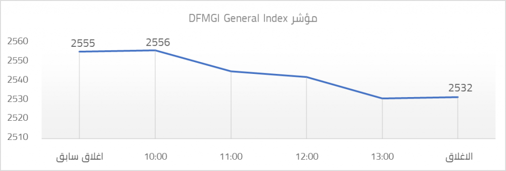 افتتح مؤشر DFGGI “المؤشر العام لسوق دبي المالي” تعاملاته ليوم 15 نوفمبر عند مستوى 2555 وأغلق المؤشر عند مستوى 2532 نقطة وحقق انخفاضا بمقدار 23 نقطة أي ما يمثل 0.93%.