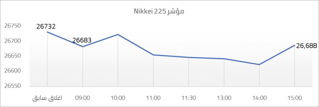 افتتح مؤشر Nikkei 225 “مؤشر يضم أكبر 225 شركة يابانية” تعاملاته ليوم 15 ديسمبر عند مستوى 26732 نقطة، وأغلق عند مستوى 26688 نقطة وحقق انخفاضا بمقدار 45 نقطة أي ما يمثل 0.17%.