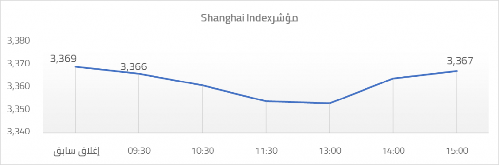 افتتح مؤشر SSE” مؤشر يضم جميع الأسهم المقيدة في بورصة شنغهاي بالصين” تعاملاته ليوم 15 ديسمبر عند مستوى 3369 وانخفض خلال تعاملات الجلسة وأغلق عند مستوى 3367 نقطة محققا انخفاضا هامشيا بمقدار 2 نقطة أي ما يمثل نسبة 0.06%، تتمثل منطقة الدعم الأولى عند مستوى 3000، أما منطقة المقاومة فتتمثل عند مستوى 3500 وهي منطقة مقاومة قوية في الوقت الحالي للمؤشر.