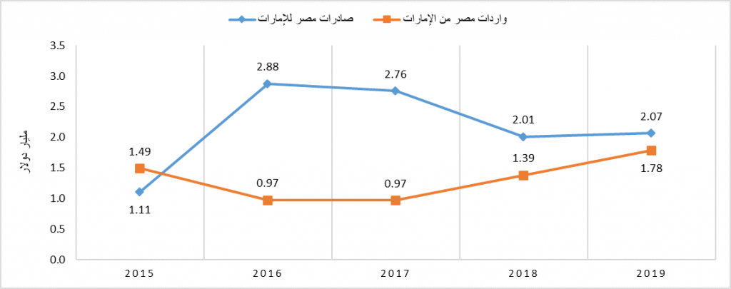 من الرسم البياني السابق، يُمكن القول أن صادرات مصر إلى الإمارات شهدت ارتفاعًا ملحوظًا بنحو 86.4% منذ 2015 وحتى 2019؛ إذ سجلت ارتفاعًا من 1.11 مليار دولار إلى 2.07 مليار دولار. كما سجلت الواردات المصرية من الإمارات ارتفاعًا أيضًا ولكن بنسبة أقل تبلغ 19.4% فقط من 1.49 مليار دولار خلال 2015 حتى 1.78 مليار دولار في العام الماضي. وبهذا نجد أن الميزان التجاري بين الدولتين يصب لصالح الاقتصاد المصري حيث تجاوزت قيمة الصادرات المصرية للإمارات قيمة واردتها من هناك عدا عام 2015، وهو ما يُمكن توضيحه من الرسم الآتي: