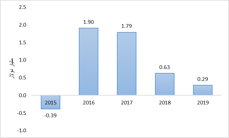 يتضح من الشكل السابق أن الميزان التجاري يميل إلى الجانب المصري على الرغم من انخفاض قيمة الفائض التجاري خلال 2019 إلى 0.29 مليار دولار.