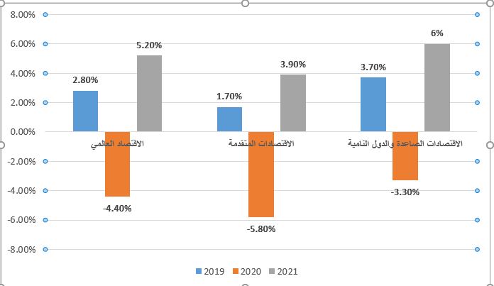 أصدر صندوق النقد الدولي، في أكتوبر الماضي، توقعاته بشأن معدلات النمو الاقتصادي العالمية المتوقعة؛ فعلى المدى القريب توقع صندوق النقد الدولي أن يبلغ النمو العالمي -4.4% عام 2020، ثم يرتفع الى 5.2% عام 2021.