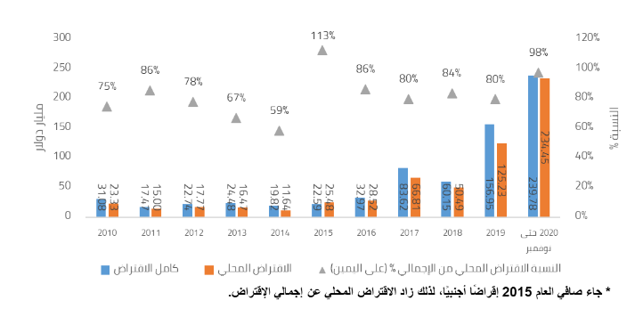 يتضح من الشكل أن الحكومة التُركية مالت خلال العامين الأخيرين إلى زيادة مُعدلات اقتراضها، بحيث اقترضت خلال العاميين السابقين نحو 396 مليار ليرة وهو ما يزيد عن مُستوى جميع السنوات التسع السابقة بأكملها والذي بلغ 314 مليار ليرة. من ناحية أخرى يتضح أن مُعدل الاقتراض خلال العام 2020 حتى شهر نوفمبر تجاوز مرة ونصف مستوى العام 2019. وتجب الإشارة إلى أن اقتراض العام الحالي جاء مُعظمه وبنسبة 98% من إجماليه داخليًا بسبب عدم قُدرة الحكومة على الاقتراض من الخارج في ظل سوء موقفها وتردي سعر صرف الليرة، وانخفاض تصنيفها الائتماني إلى المستوى B2 في الوضع غير الاستثماري مع نظرة مُستقبلية سالبة، وهو ما انعكس بالتبعية على الشركات المحلية فيما يُسمى بأثر التزاحم.