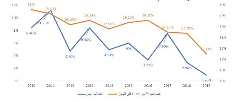 يتضح من الشكل أن الضرائب تُشكل المصدر الرئيس للإيرادات بحيث لم تقل نسبتها في أي من أعوام الفترة الموضحة عن 79%، فيما بلغت في مُتوسط أعوام الفترة نحو 85% من إجمالي الإيرادات، بالتالي فإنه يتوقع للإيرادات العامة أن تنخفض إذا ما تأثرت الحصيلة الضريبية بأي شكل. من جانب آخر تجب الإشارة إلى أن الحصيلة الضريبية تتناسب طرديًا مع مُعدلات النمو كما يوضح الشكل التالي: