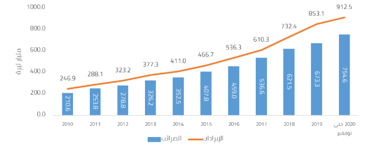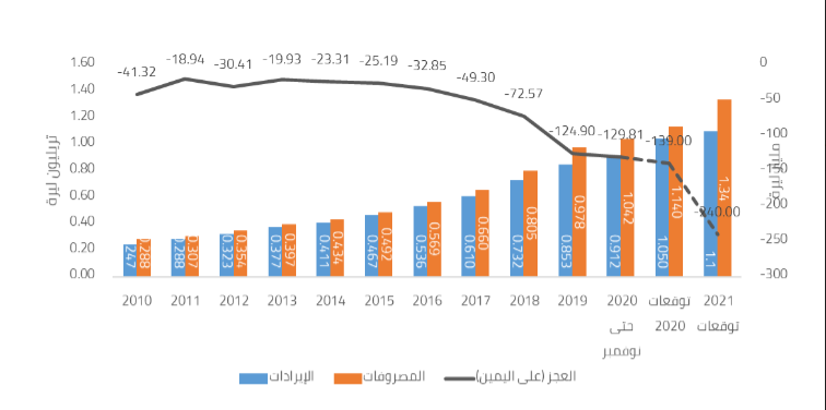 ذهبت الحكومة إلى تقدير إيرادات الموازنة خلال العام الجديد بنحو 1.1 ترليون ليرة، بزيادة نحو 50 مليار ليرة عن العام 2020، كما توقعت نفقات إجمالية بنحو 1.34 تريليون ليرة، بزيادة قدرها نحو 200 مليار ليرة في 2020، مما رفع العجز وفقًا لهذه التوقعات إلى 245 مليار ليرة بما يوازي 31 مليار دولار، وذلك مُقارنة بنحو 139 مليار ليرة كانت قد توقعتها للعام الجاري. وبهذا يكون مقدار العجز المتوقع للعام القادم نحو 170% من العجز المتوقع للعام الجاري الذي توقع له أن يبلغ 139 مليار ليرة، وقد بلغ حتى نوفمبر 129 مليارًا. يوضح الشكل التالي إيرادات ونفقات الموازنة العامة التُركية المُتوقعة خلال العام القادم مُقارنة مع السنوات بداية من 2010: