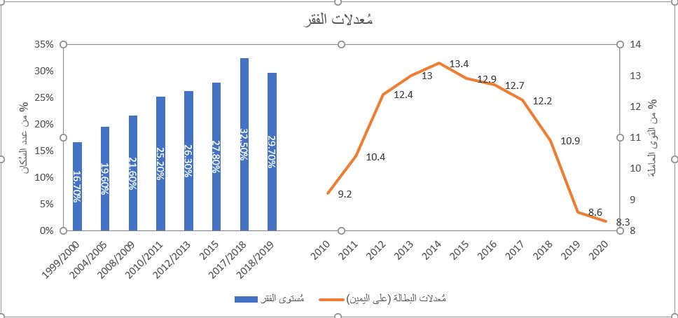 يتبين من الشكل ارتباط مُعدلات البطالة ومُعدلات الفقر خطيًا، بناء عليه ظلت مُعدلات الفقر في اتجاه الارتفاع حتى العام 2015، ومع بداية تطبيق برنامج الإصلاح الاقتصادي، انخفضت مُخصصات دعم المواد البترولية من 120.8 مليار جنيه في موازنة العام المالي 2017/2018 إلى 28.19 مليار جنيه في موازنة العام المالي 2020/2021، وقد ترتب على ذلك: