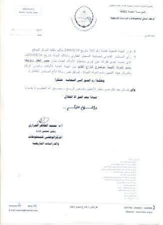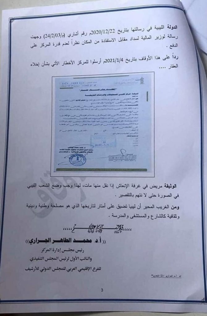 ورغم ذلك أرسلت هيئة الأوقاف خطابًا للمركز الليبي للمحفوظات والدراسات التاريخية يوم 4 يناير الجاري تمهله فيه ثلاثة أيام لإخلاء المقر وتسليمه لها وفقًا لحكم صادر عن محكمة الاستئناف بطرابلس بشأن تبعية الأرض المُقام عليها مقر المركز للأوقاف.