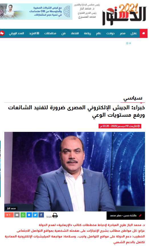 الدستور | “خبراء: الجيش الإلكتروني المصرى ضرورة لتفنيد الشائعات ورفع مستويات الوعي” 16 ديسمبر.