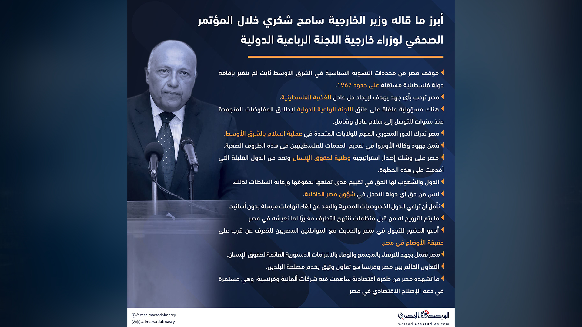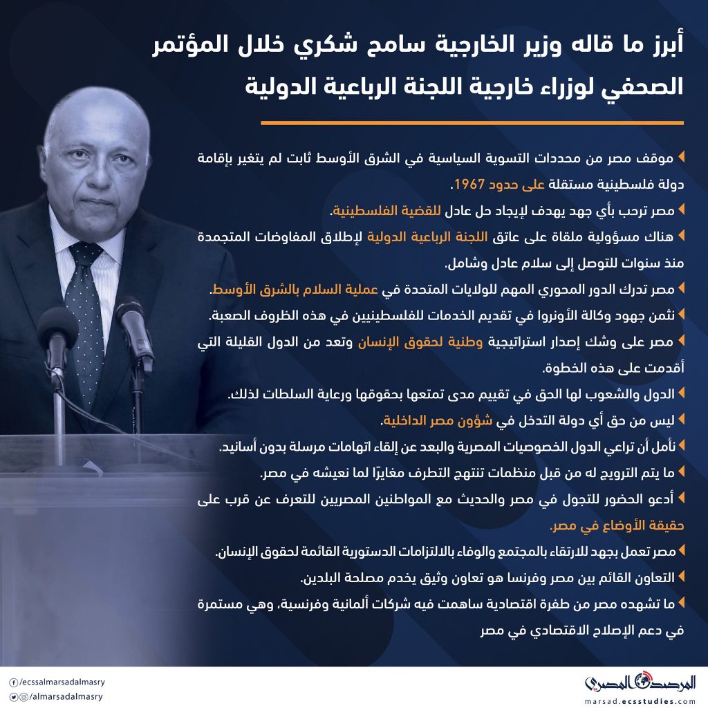 أبرز ما قاله وزير الخارجية سامح شكري خلال المؤتمر الصحفي لوزراء خارجية اللجنة الرباعية الدولية.