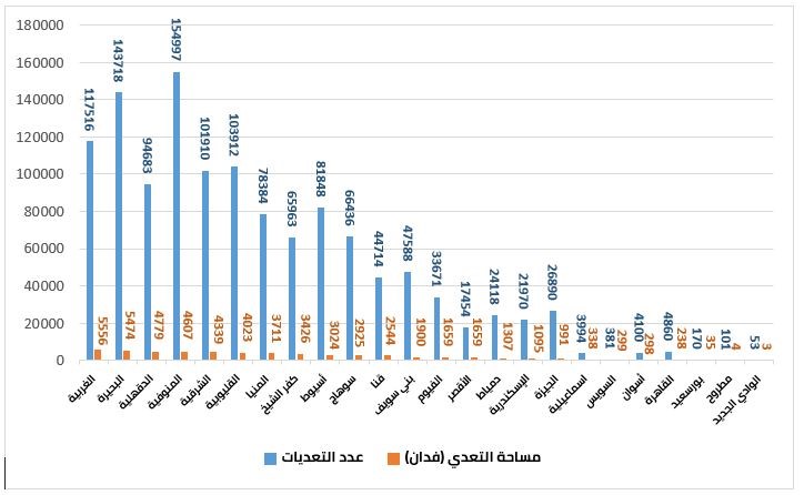 وهو المحور الأخطر في ظل الأزمة، فوفقًا لبيانات صادرة من وزارة الزراعة عام 2019، كشفت أن خلال الفترة من 25 يناير 2011 حتى يوليو 2018 بلغت أعداد التعديات مليون و900 ألف حالة تعدى على الأراضي الزراعية بمساحة تتخطى 66 ألف فدان. فيما بلغ إجمالي حالات التعدي على الأرض الزراعية في الفترة من 11/6/2018 حتى 1/7/2019 ” عدد 58179 حالة بمساحة حوالي 3036 فدانا.