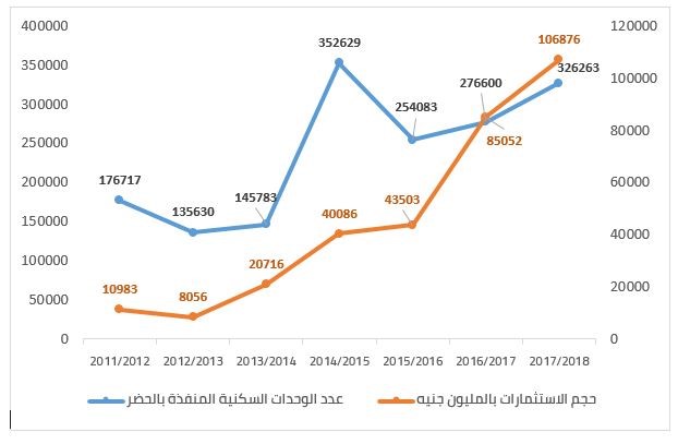تطور عدد الوحدات السكنية المنفذة بالحضر واستثماراتها بالمليون جنيه في مصر خلال الفترة (2011/2012- 2017/2018)