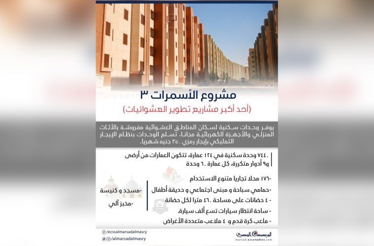 ومن أبرز المشروعات التي إنشائها في هذا الصدد مشروعات إسكان الأسمرات وبشائر الخير، والتي تهدف إلى توفير وحدات سكنية لسكان المناطق العشوائية مفروشة بالأثاث المنزلي والأجهزة الكهربائية مجانًا، على أن تسلم الوحدات بنظام الايجار التمليكي بإيجار رمزي قيمته 350 جنيه شهريًا. وصرح الدكتور مصطفى مدبولي، رئيس مجلس الوزراء، بأنه جاري الإعداد لخطة مجتمعات متكاملة بمنطقة مسطرد على غرار ما جري إنشائه في مجمع الأسمرات وبشاير الخير، بمساحات الأراضي المملوكة بالدولة.