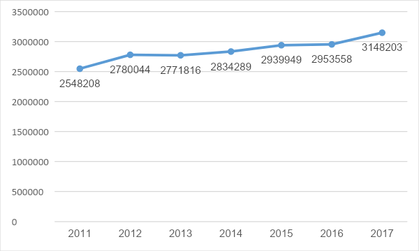 شكل رقم (4): تطور مساحة الأراضي الزراعية الجديدة (بالفدان) في مصر خلال الفترة (2011- 2017)
