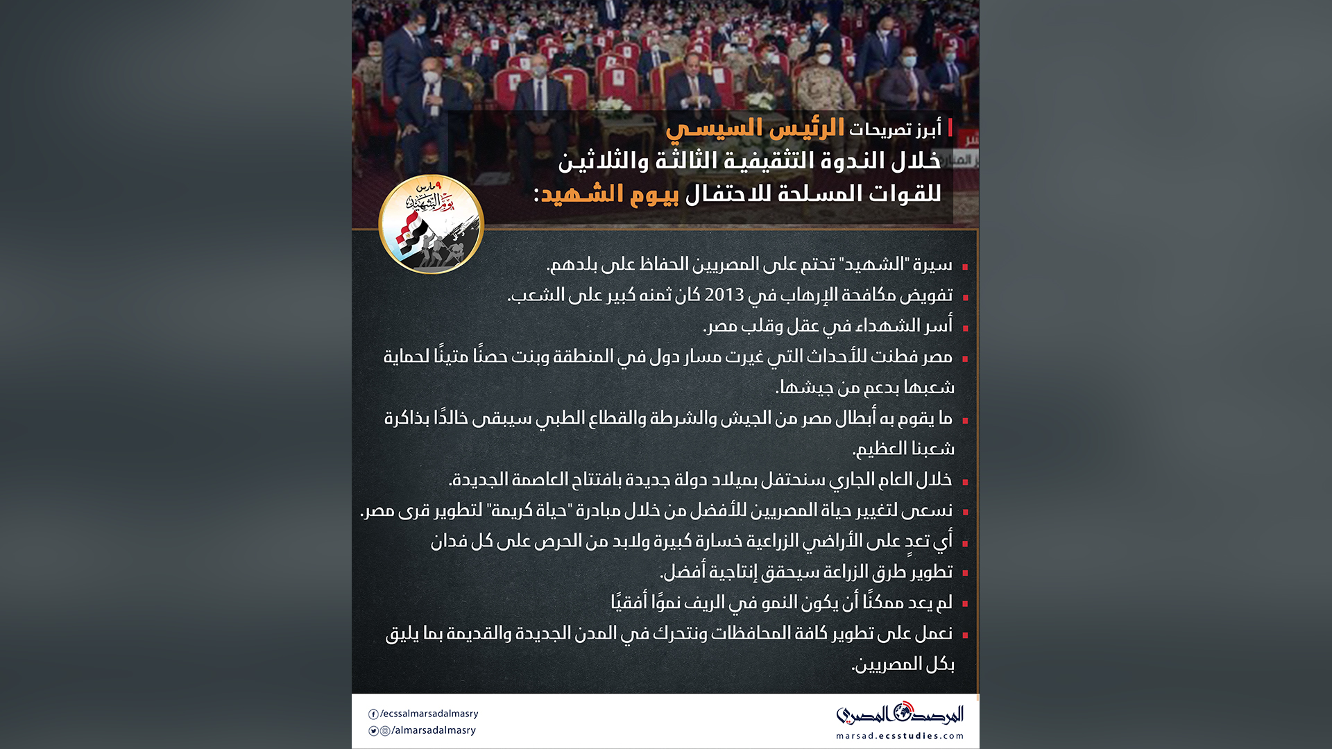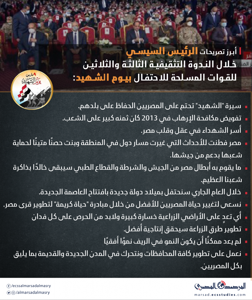 ما يقوم به أبطال مصر من الجيش والشرطة والقطاع الطبي سيبقى خالدًا بذاكرة شعبنا العظيم، ضمن أبرز ما قاله الرئيس عبد الفتاح السيسي خلال الندوة التثقيفية الثالثة والثلاثين للقوات المسلحة للاحتفال بيوم الشهيد.