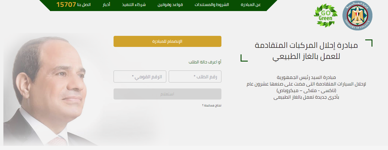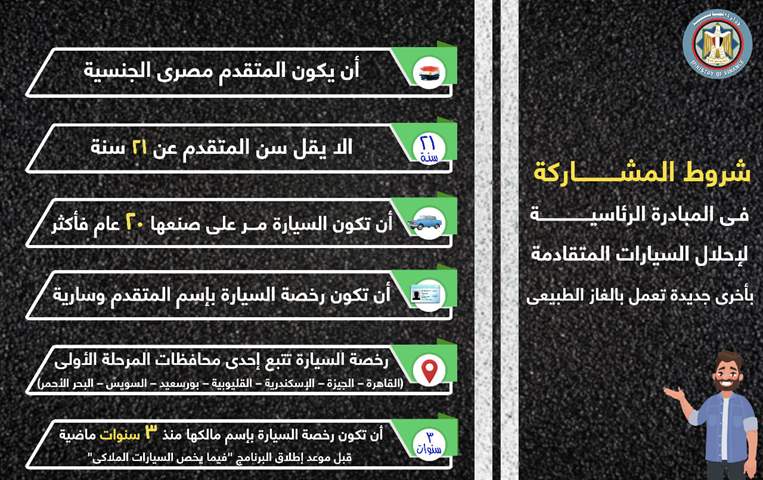 وبتاريخ السادس عشر من الشهر الجاري أضافت المبادرة الرئاسية لإحلال السيارات المتقادمة للعمل بالغاز الطبيعي والتي تجري تحت إشراف وزارة المالية شرطًا جديدًا للانضمام لها وبحسب الموقع الإلكتروني للمبادرة يشترط أن تكون رخصة السيارة باسم مالكها قبل ثلاث سنوات من التسجيل في المبادرة وهو الشرط الذي يتم تطبيقه على السيارات الملاكي.