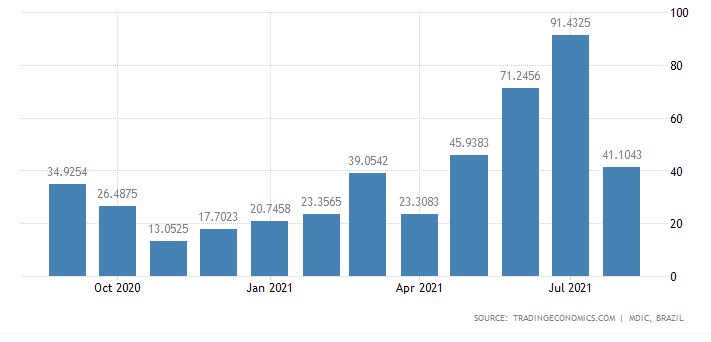 رسم بياني يوضح حجم الصادرات المصرية للبرازيل في الفترة من أكتوبر 2020 لــ أغسطس 2021 وفقاً لموقع ” ترايد أكونوميكس”