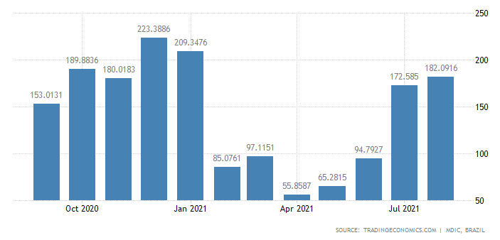 رسم بياني يوضح حجم الواردات المصرية من البرازيل في الفترة من أكتوبر 2020 لــ أغسطس 2021 وفقاً لموقع ” ترايد أكونوميكس”.