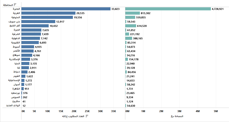 ويبلغ إجمالي أعداد التعديات المستهدف إزالتها حوالي ١٦٥٠٨١ حالة تعد على مساحة ١٩.٣٥٧ مليون متر مربع تقريبا. ليكون إجمالي أعداد التعديات المتبقية حوالي ١٥٧ ألف حالة تعد على مساحة ١٧.٧٠ مليون متر مربع تقريبًا. وجار تنفيذ هذه الحملات، طبقا لتكليفات رئيس الجمهورية، بإزالة التعديات على نهر النيل والمجاري المائية، في غضون ٦ أشهر.