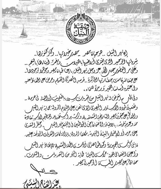 واختتمت الوثيقة بما يلي: ” فإنني كرئيس للجمهورية وكمواطن مصري أدشن الحملة الشعبية لإنقاذ نهر النيل وأعلن انضمامي للجنة “حراس النيل” لحماية النهر من التعديات والتلوث، حفاظًا على مصدر الحياة الوحيد في مصر.”
