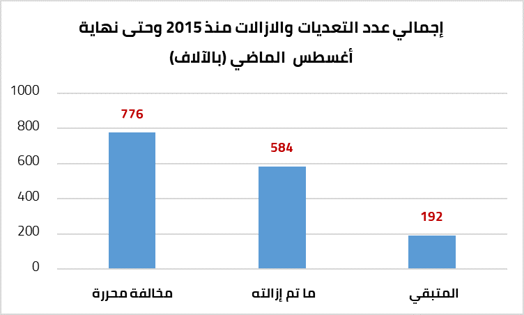 فقد بلغ إجمالي التعديات على حرم النيل المحررة منذ 2015 وحتى نهاية أغسطس الماضي حوالي 776 ألف حالة تعدي، تم إزالة حوالي 584 ألف منها ويتبقى 192 ألف حالة تعدي تحتاج لإزالة.