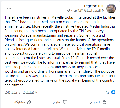وقال المتحدث باسم الحكومة الإثيوبية ليجيس تولو، الذي سبق ونفى الواقعة، في منشور على فيسبوك يوم الأربعاء 20 أكتوبر إن الجيش يقوم بهجمات جوية دقيقة ويبذل قصارى جهده لتجنب وقوع خسائر في صفوف المدنيين.