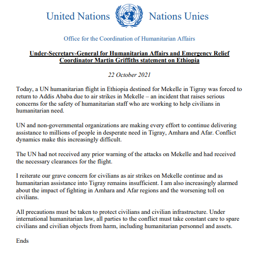 وفي بيان صادر عن الأمم المتحدة يوم 22 أكتوبر، ذكر أنه: ” اليوم، أُجبرت رحلة جوية إنسانية تابعة للأمم المتحدة في إثيوبيا متجهة إلى ميكيلي في تيجراي على العودة إلى أديس أبابا بسبب الضربات الجوية في ميكيلي – وهو حادث يثير مخاوف جدية على سلامة العاملين في المجال الإنساني الذين يعملون على مساعدة المدنيين المحتاجين للمساعدة الإنسانية.