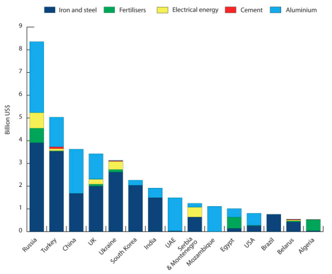 الشكل رقم (1) يوضح البضائع المتأثرة بـــ  “آلية تعديل حدود الكربون” (CBAM) حسب البلد والقطاع 2019