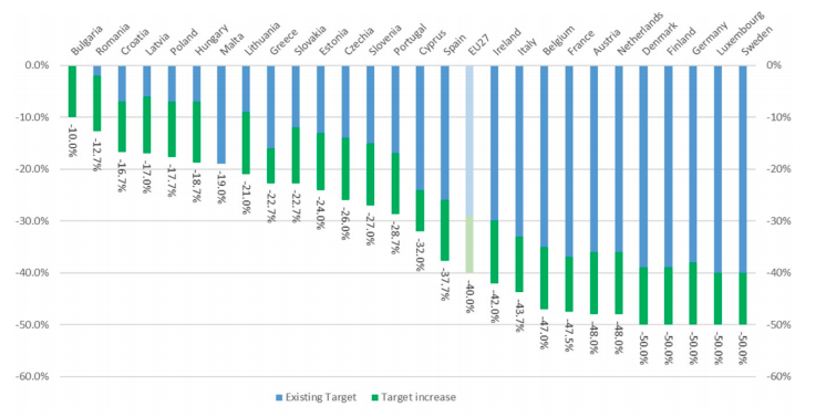 فكرة “تشارك الجهود” هي أن الدول الأعضاء تساهم بطريقة عادلة ومنصفة في العمل المناخي للاتحاد الأوروبي، مع تحديد الأهداف الوطنية على أساس الناتج المحلي الإجمالي. ويوضح الرسم البياني التالي تقسيم أهداف ( ESR) بين الدول الأعضاء ، حيث يشير اللون الأزرق إلى أهداف 2030 الحالية واللون الاخضر يشير إلى أهداف اللجنة الجديدة.