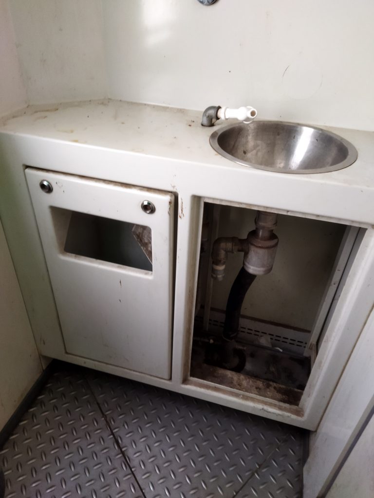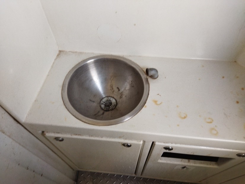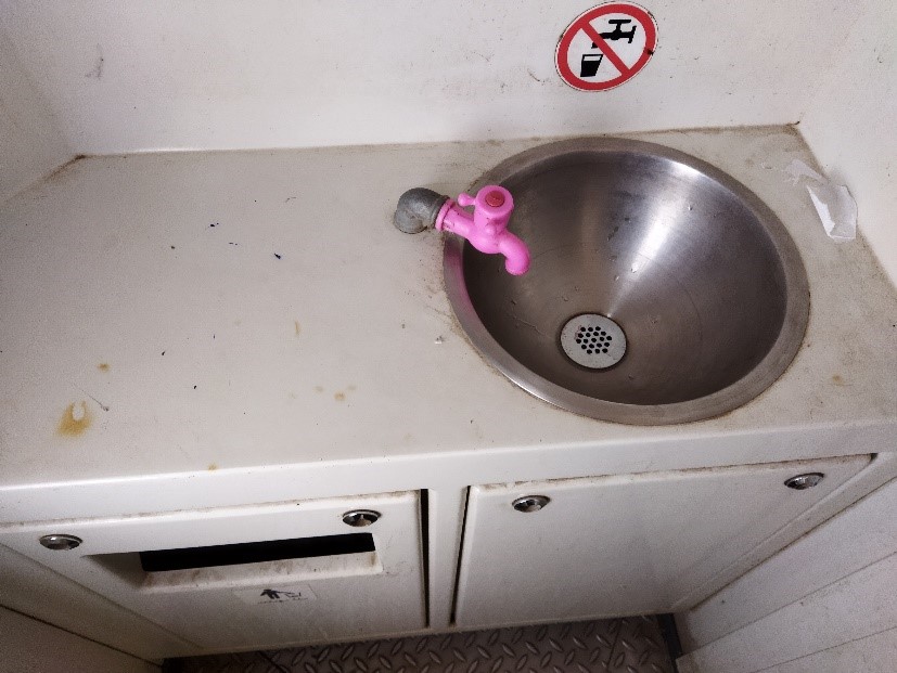 سوء حالة دورات المياه كان أكثر ما تم ملاحظته أثناء الرحلة؛ فلم يُسجل وجود مرحاض واحد نظيف أو ذي رائحة طبيعية على امتداد القطار، بجانب أن قواعد دورات المياه “الأفرنجي” كانت مهشمه ومتسخة بشكل ظاهر، ولقد تلاحظ أن جميع الصنابير “الاستانلس تيل” على الأحواض كانت قد فُقدت وتم استبدال أخرى بلاستيكية، فيما اختفت الصنابير بشكل كامل من دورات مياه أخرى.