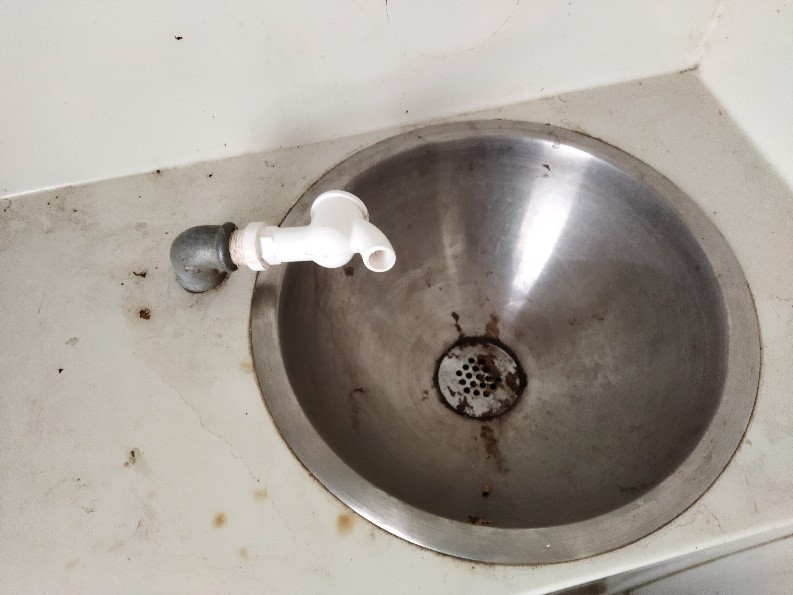 لوحظ كذلك وجود تسريب للمياه في بعض دورات المياه جراء فقدان قطع محابس جانبية، فضلًا عن وجود قطع معدنية مختفيه من جسم دورة المياه، ونشير إلى أن تلك القطع المعدنية عادة ما يتم فكها وتركيبها من قبل الفنيين في الورش للوصول إلى المواسير والوصلات الرئيسية المغذية للحنفيات والمحابس.