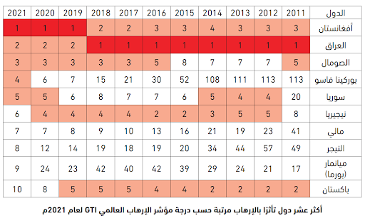 المصدر: مؤشر الإرهاب العالمي 2022م – قياس تأثير الإرهاب، مركز التحالف الإسلامي العسكري لمحاربة الإرهاب (الرياض: تقارير دولية، العدد 37، ص6)