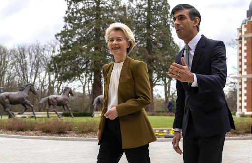 توصلت المملكة المتحدة بقيادة رئيس الوزراء “ريشي سوناك”، والاتحاد الأوروبي، بقيادة رئيسة المفوضية الأوروبية “أورسولا فون دير لاين”، أخيرًا إلى اتفاق بعد شهور من المحادثات حول قواعد التجارة المثيرة للجدل بعد خروج بريطانيا من الاتحاد الأوروبي لأيرلندا الشمالية، وروج كلا الجانبين للاتفاق على أنه “إعادة ضبط” للعلاقات المتوترة بين الطرفين، وسيكون بمثابة فصلًا جديدًا من شأنه طي صفحة صراعات الماضي، وتحديدًا بعد 25 عامًا من اتفاق سلام تاريخي قد أنهى عقودًا من الصراع المسلح بأيرلندا الشمالية.