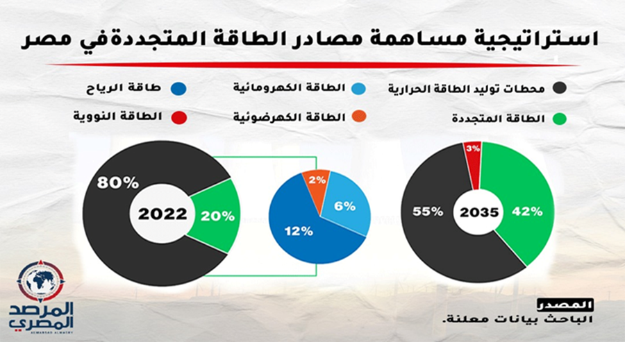 لدى مصر تاريخ طويل في تشجيع التحول إلى الطاقة المتجددة، وعلى الرغم من أنها تُعد دولة منتجة للوقود الأحفوري، وعلى الرغم من اعتمادها على الوقود التقليدي (النفط والغاز الطبيعي) في توليد الكهرباء (بنسبة أكبر من حوالي 70%)، إلا أنه يوجد اهتمام وطني متزايد بتنويع مزيج الطاقة والاستفادة من إمكانات الطاقة المتجددة المتوفرة في مصر. حيث تستهدف مصر وصول نسبة مساهمة الطاقة المتجددة بقدرة توليد الكهرباء إلى حوالي 42% بحلول عام 2035، لتشمل حوالي 14% كهرباء مستمدة من طاقة الرياح، وحوالي 21% من الطاقة الشمسية الكهروضوئية، بالإضافة إلى الطاقة الكهرومائية والطاقة الشمسية المركزة، والطاقة النووية بحوالي 3%، كما هو موضح في الشكل التالي فيما يتعلق بالنسب المستهدفة. وهنا تجدر الإشارة إلى أن مصر نجحت في رفع نسبة مساهمة الطاقة المتجددة في قدرة توليد الكهرباء إلى حوالي 22% وذلك في السنوات الماضية.