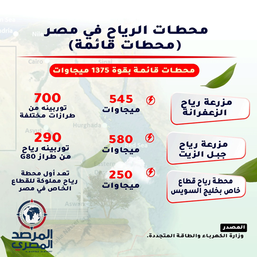 واستكمالًا لما سبق، تمتلك مصر أفضل مناطق في العالم تتميز بسرعات رياح عالية، مثل البحر الأحمر وخليج السويس، فضلاً عن شرق وغرب النيل، حيث تُعد طاقة الرياح أرخص تكلفة من الطاقة الشمسية، بالإضافة إلى انتشار تكنولوجيا طاقة الرياح وقيام مصر بتصنيع المكونات محليًا، يمكن لمصر أن تكون مصدرًا للطاقة لدول العالم، خاصةً أوروبا، وتمتلك مصر 3 مزارع كبيرة للرياح (مشروعات قائمة)، كما هو موضح في الشكل التالي.