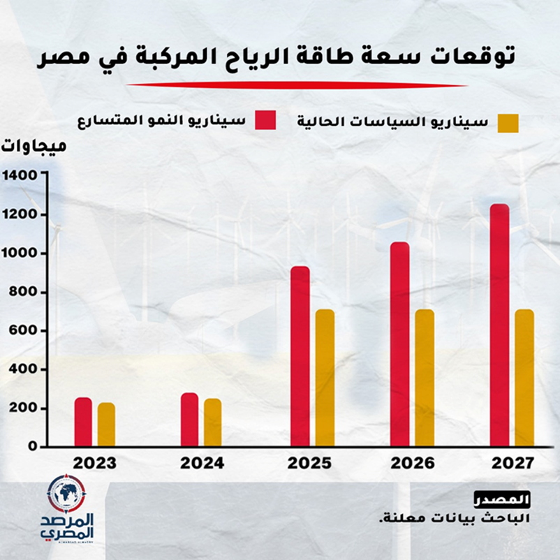 في السيناريو القائم على السياسات الحالية (استمرار التركيب كما هو مخطط)، يتوقع مجلس الرياح العالمي تركيب حوالي 2.6 جيجاوات من سعة الرياح في مصر بين عامي 2024 و2027، أما في سيناريو النمو المتسارع (الذي يعتمد على تسريع المشروعات وإزالة الحواجز وضخ المزيد من الاستثمارات)، فمن المرجح أن تشهد البلاد تركيبًا إجماليًا يقترب من حوالي 4 جيجاوات وذلك بحلول عام 2027، كما هو موضح في الشكل التالي.