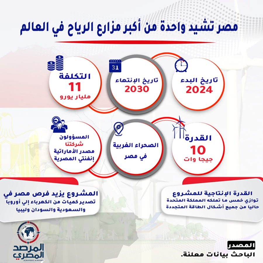من المتوقع أن تحتضن مصر أكبر محطة طاقة رياح في العالم بقدرة تصل إلى حوالي 10 جيجاوات، من خلال شراكة عربية، حيث سيسهم مشروع المحطة في تفادي إطلاق حوالي 23.8 مليون طن من الانبعاثات سنويًا، تمثل حوالي 9% من مجموع انبعاثات الكربون في مصر. وستوفر محطة طاقة الرياح البرية الجديدة لمصر ما يُقدر بنحو 5 مليارات دولار من تكاليف الغاز الطبيعي السنوية، إضافة إلى توفير ما يصل إلى حوالي 100 ألف فرصة عمل، كما هو موضح في الشكل التالي.
