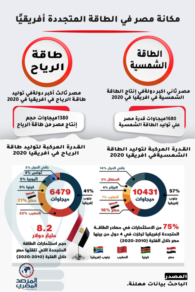 تتويجًا للجهود المميزة التي اتخذتها الدولة في ملف الطاقة المتجددة (وبالأخص طاقة الرياح)، جاءت مصر في المرتبة الأولى في المنطقة العربية في إنتاج الكهرباء من طاقة الرياح والطاقة الشمسية، بمعدلات إنتاج تبلغ نحو 3.5 جيجاوات، ومستهدف الوصول بها إلى نحو 6.8 جيجاوات العام الحالي 2024، ومقسمة بين نحو 1.6 جيجاوات من طاقة الرياح ونحو 1.9 جيجاوات من محطات الطاقة الشمسية. أفريقيًا احتلت مصر المركز الثاني فيما يتعلق بمساهمتها في إنتاج الطاقة الشمسية على مستوى القارة الأفريقية والتي بلغت نحو 16%، فيما تأتي في المركز الثالث في إنتاج طاقة الرياح وبنسبة نحو 21%، كما هو موضح في الشكل التالي.