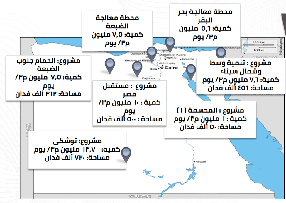 ثلاث مشروعات كبرى لإعادة استخدام مياه الصرف الزراعي بطاقة تصل إلى ٤.٨٠ مليار متر مكعب سنوياً ، هي محطة بحر البقر بطاقة ٥.٦٠ مليون متر مكعب/ يومياً والتي تهدف لاستصلاح ٤٢٠ ألف فدان في سيناء ، ومحطة المحسمة بطاقة ١.٠٠ مليون متر مكعب/ يومياً والتي تهدف لاستصلاح ٤٢.٨٠ ألف فدان في سيناء ، وهى المشروعات التي تم خلالها تنفيذ بنية تحتية ضخمة من السحارات أسفل قناة السويس والكباري ومحطات الرفع وقناطر الحجز ، بالإضافة لمحطة الحمام بطاقة ٧.٥٠ مليون متر مكعب/ يومياً حيث يجرى حالياً إنشاء مسار لنقل مياه الصرف الزراعي إليها بطول ١٧٤ كيلومتر ( ١٥٢ كيلومتر ترع مكشوفة – ٢٢ كيلومتر مواسير ) وتضم عدد ١٢ محطة رفع و ١٢٤ محطة رفع أساسية و ٢٣ محطة رفع احتياطية و ١٠٣ عمل صناعي .
