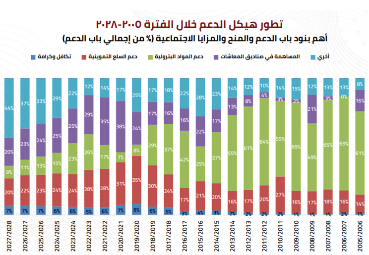 - دعم الوقود والكهرباء: ويتم من خلال هذه المنظومة بيع الوقود ويشمل (البنزين، والديزل، والغاز الطبيعي المستخدم في المنازل)، والكهرباء الموجهة للاستخدام المنزلي وبخاصة الشرائح الاستهلاكية الثلاث الأولى، بأسعار مدعومة تقل عن تكلفة الإنتاج.