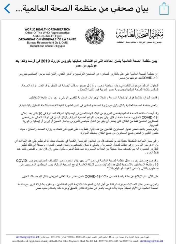 في آخر التطورات أعلنت منظمة الصحة العالمية أنها على علم بكافة التفاصيل لحالات الإصابة بكورونا في فرنسا وكندا لأشخاص عائدين من مصر حيث كانت الحالات في زيارة سياحية لمصر، وأكدت المنظمة في هذا السياق أن الحالات المكتشفة حديثا، سواء الحالتين الفرنسيتين، والحالة الكندية تم اكتشافها في بلادهم حيث لم تظهر على هذه الحالات أي من الأعراض أثناء مرورهم بنقاط الدخول المصرية، وبالتالي لم يتسن اكتشافهم من خلال فحص الدخول.