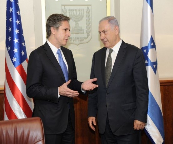 أما عن الصراع العربي الإسرائيلي ، متأثراً بنشأته وهويته فقد دعم بلينكن حق إسرائيل في الدفاع عن نفسها خلال العدوان الإسرائيلي على غزة عام 2014 كما له عدة مواقف توضح تحيزه لإسرائيل منها تصريحاته خلال حملة بايدن الرئاسية بأن إدارة بايدن حال وصولها للبيت الأبيض ” لن تربط بين المساعدات العسكرية لإسرائيل وأي قرارات للحكومة الإسرائيلية قد نختلف معها كقرارات ضم الأراضي” ، وبرغم اختلافه مع إدارة ترامب بالأخص في سياستها الخارجية ألا أنه أثنى على جهودها التي أدت لتطبيع العلاقات بين إسرائيل والإمارات والبحرين.